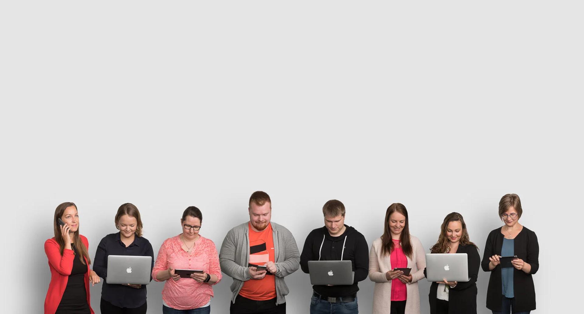 Kuvasin Talenomin hoiva-alan tiimistä ryhmäkuvan. Itse asiassa kuvasin henkilöt erikseen Talenomin neukkaariin tehdyssä kuvauspisteessä ja rakensin ryhmäkuvan yksittäisistä valituista henkilökuvista.